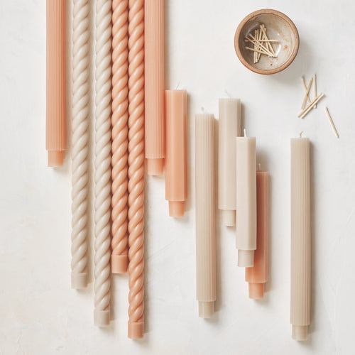 Our Fancy Taper Candles are hand-molded and embody a superior depth of color. A cotton wick is used for the cleanest burn, and the base is sized to fit a standard holder. Each 6” candle is crafted to burn for six hours. Subtle variations in wax depth and color opacity may occur.
