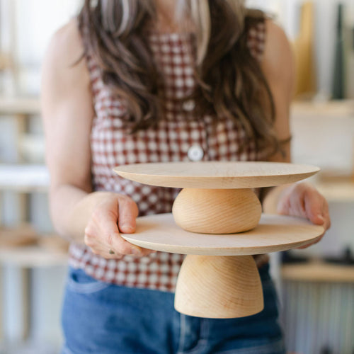 We fell in love with Elise McLauchlan's handcrafted creations. Each piece is unique and exudes a soulful presence. This handmade Maple Cake Stand is crafted in Canada in her studio. It's finished with a natural beeswax wood butter. Variations in wood color and grain is natural and part of the charm.