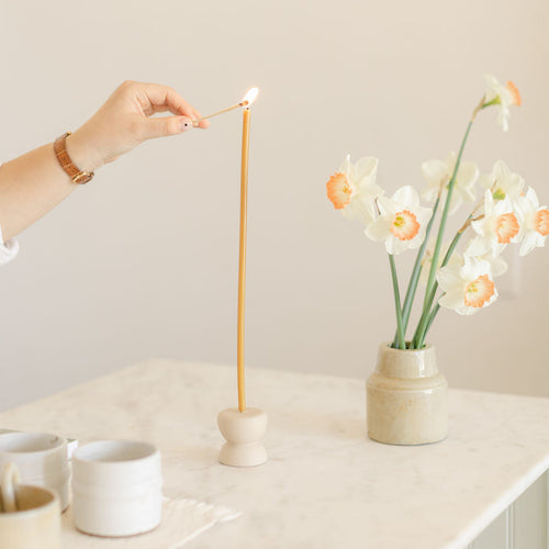 Both modern and organic, each soft ceramic form evokes water-sculpted river stones, finished with a matte neutral glaze. Perfectly sized to fit our delicate Long Stem Candles. Display individually for a minimal statement or cluster together for a dynamic collection.