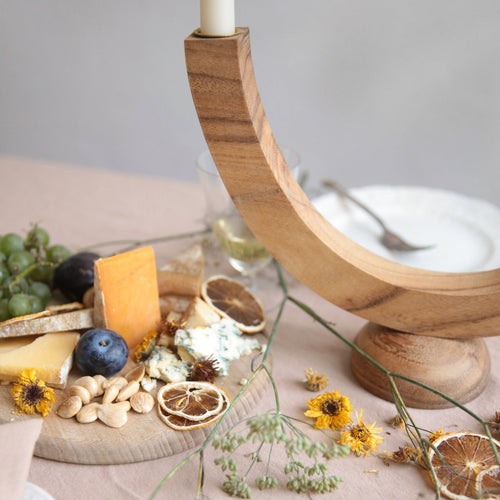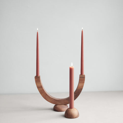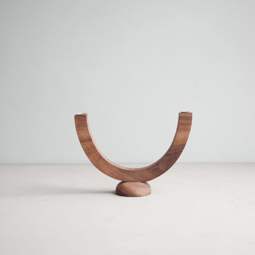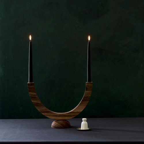 Our hand-finished wooden candelabra is inspired by the changing phases and warm glow of the moon. A sculpted crescent of sustainably sourced walnut balances on a smooth, domed base. Two solid brass candle cups each fit a standard taper. Display alone or alongside our Dusk Taper Holder. Revive as needed with mineral oil and a clean, dry cloth.