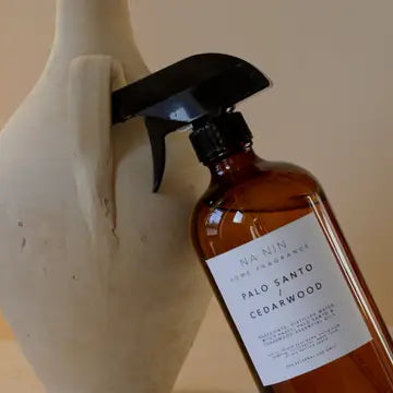 Na Nin home fragrance with blended notes of palo santo and cedarwood. Use to refresh your home living area, bedding, car interior, wash room or any desired space. Works well for spaces that you can't burn incense or candles. Made in Richmond, VA