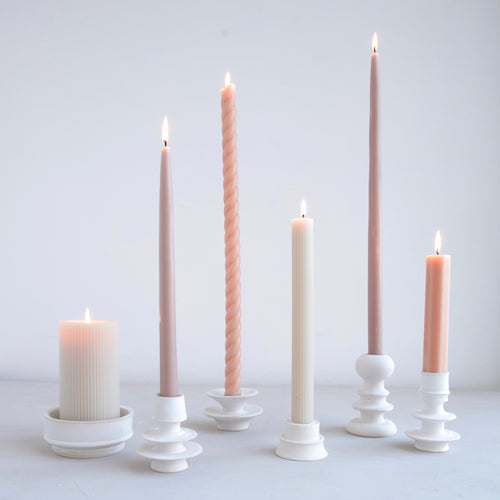 Our tapers are crafted to burn drip-free at a rate of approximately 1 hour per inch. Each candle is dipped 35 times for a superior depth of color, and pairs are joined by a braided cotton wick for the cleanest burn.